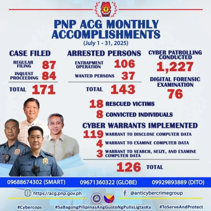 Cybersecurity PNP-ACG reports over 140 arrests, 171 cases filed in July 2025 anti-cybercrime drive August 4, 2025